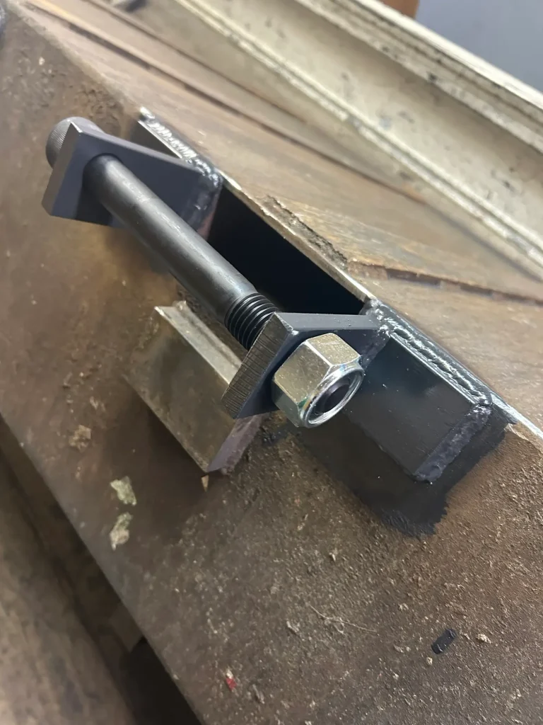 補強後のフォークリフト用バケット。爪差し込み部の金具をサイズアップし、強度を向上させています。